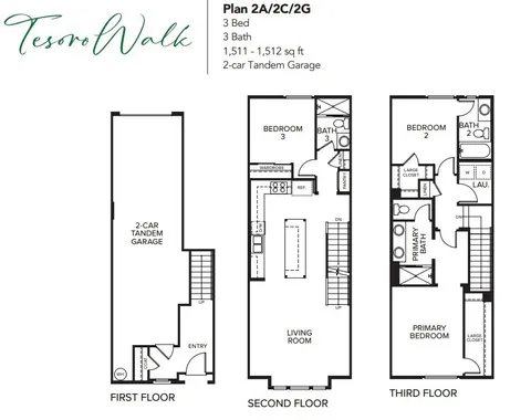 Tesoro Walk is a new gated community, located in the City of Downey, featuring 33 beautiful townhomes. This Ruby floorplan features a two-car garage, enclosed patio that leads to your front door, and a spacious entryway with coat closet on the first level. The second floor is your main living level and features a spacious kitchen with large eat-in island, an open living room, and a full bedroom with full bath. On the upper level you'll find a conveniently located laundry room, your large primary suite with walk-in closet and a secondary bedroom with private en-suite bath and its own walk-in closet. Construction is just starting on this home, so you'll have the ability to meet with a designer and build your dream home.